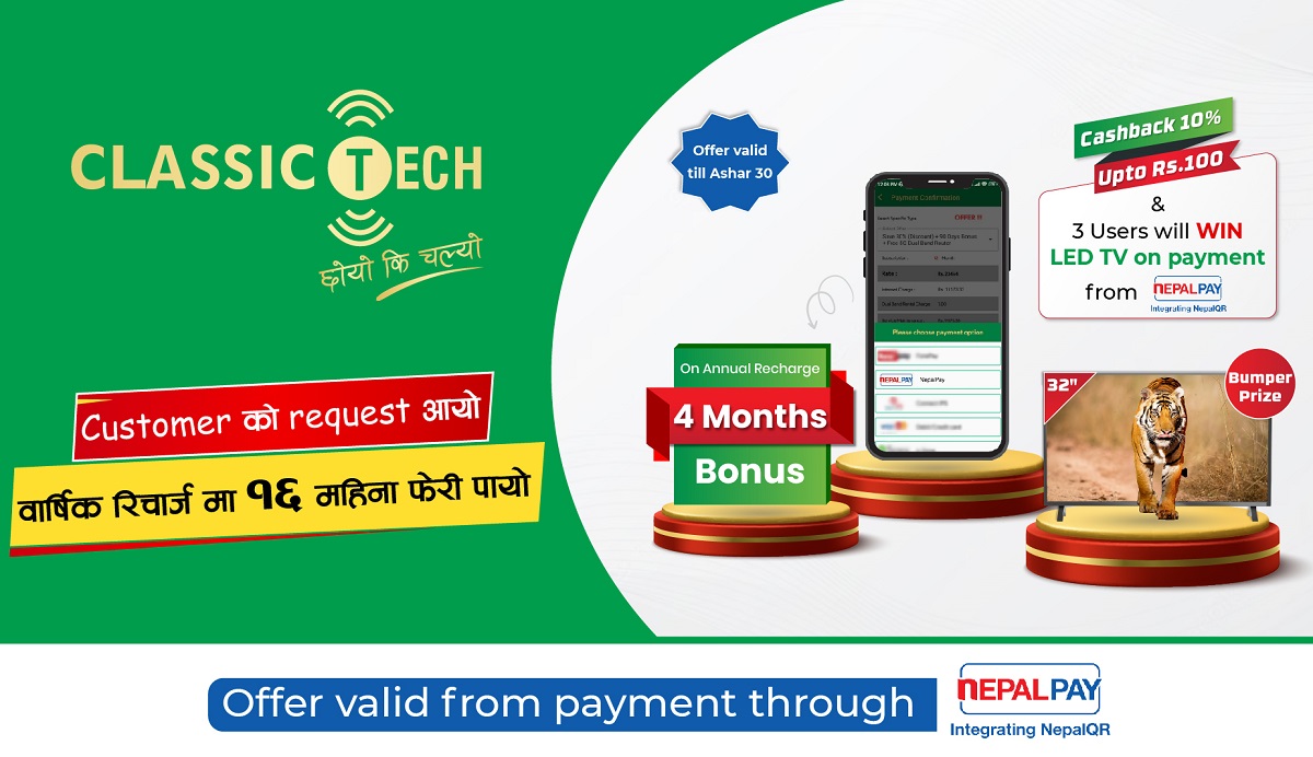 यो अफर असार २१ गतेदेखि लागू गरिएको हो। अफर आगामी असार ३० गतेसम्म लागू हुनेछ। अफर अन्तर्गत रिचार्ज प्रक्रियालाई थप सुविधाजनक बनाउन क्लासिक टेकले डिजिटल भुक्तानी प्लेटफर्म नेपाल पे क्युआरसँग साझेदारी गरेको छ।