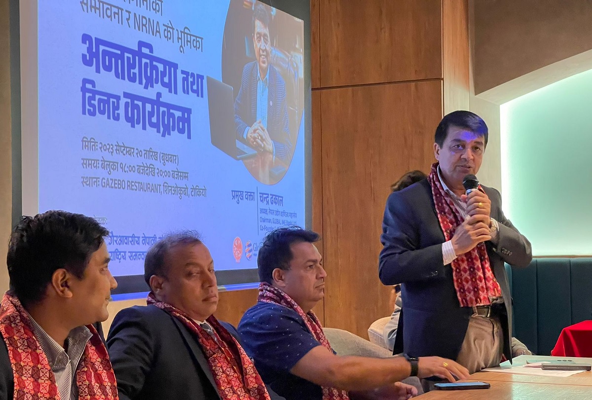 नेपालमा लगानीको सम्भावना र गैरआवासीय नेपाली संघको भूमिकासम्बन्धी अन्तरक्रिया कार्यक्रमलाई बुधबार जापानको राजधानी टोकियोमा सम्बोधन गर्दै अध्यक्ष ढकालले पर्यटन पूर्वाधारको विकास, जलविद्युत, कृषि तथा कृषिजन्य उद्योग लगायत धेरै क्षेत्रमा लगानी विस्तारकाे प्रचुर सम्भावना रहेको बताए।