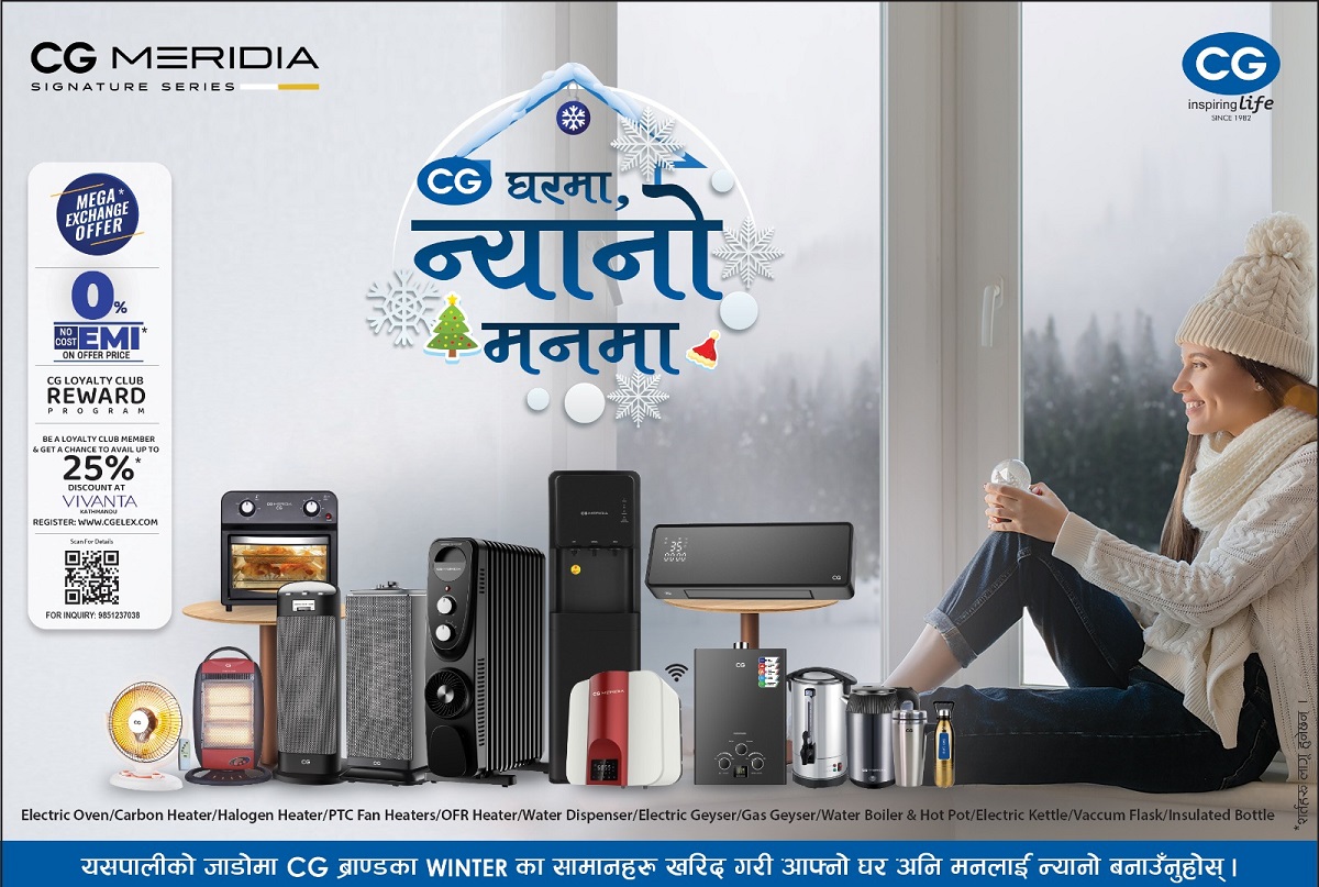 नेपालको इलेक्ट्रोनिक्स तथा घरेलु उपकरण ब्राण्ड सिजी स्मार्ट डमेस्टिक अप्लायन्सेसले जाडो मौसमलाई लक्षित गर्दै नयाँ–नयाँ जाडोका सामग्रीहरू बजारमा ल्याएको छ।
