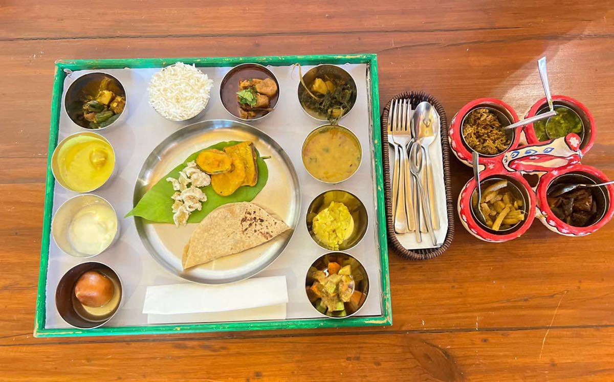 शाकाहारी मिथिला थालीमा १७ प्रकारका परिकार पाइन्छ। जसमा तिल र आलसले झानेको सलाद, आलुको चोखा, कडिबडी, बिरिया, मौसमी तरकारी, रहरको दाल, भात, दही, घ्यू रोटी, तिलौरी, तरुवालगायत चार प्रकारका अचारले थाली भरिएको हुन्छ।
