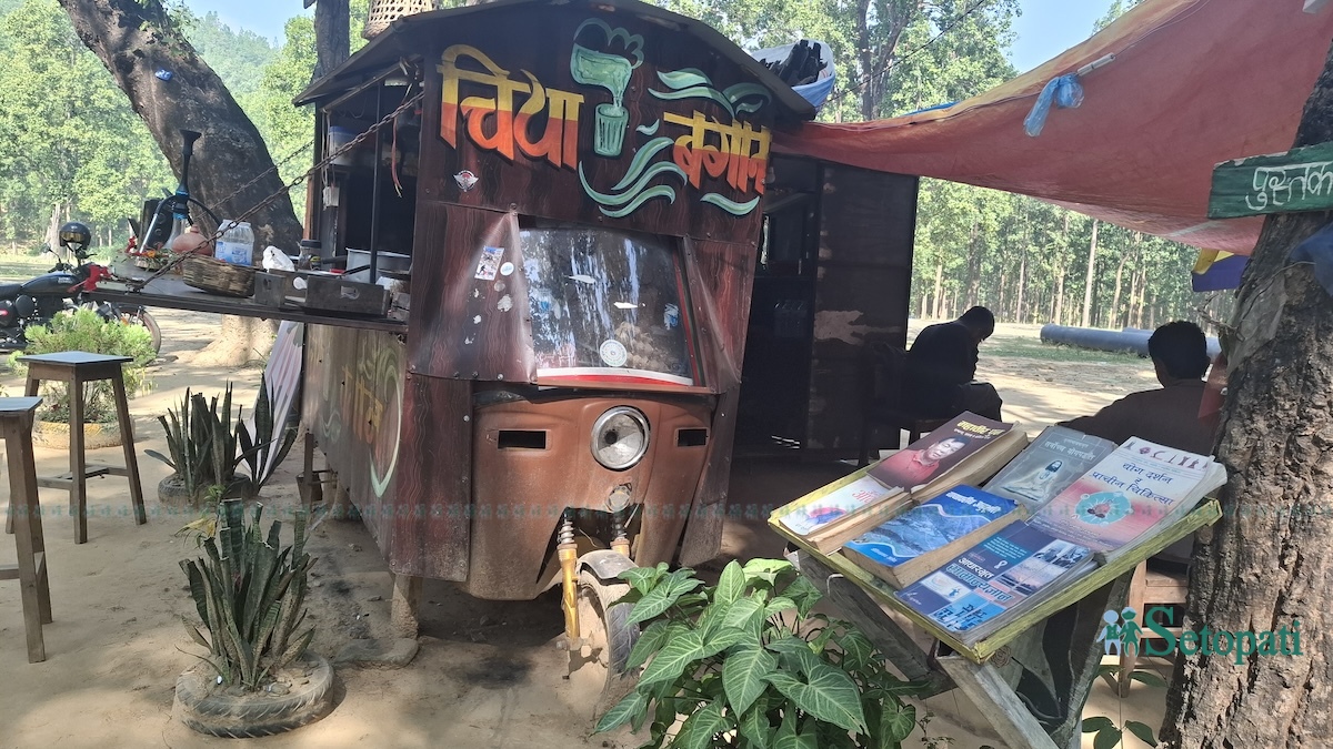 यता पुरानो अटो-रिक्सा ट्यांकी स्वरूपमा बन्दै थियो, उता गौरव चिया पसलको नाम जुराउँदै थिए।