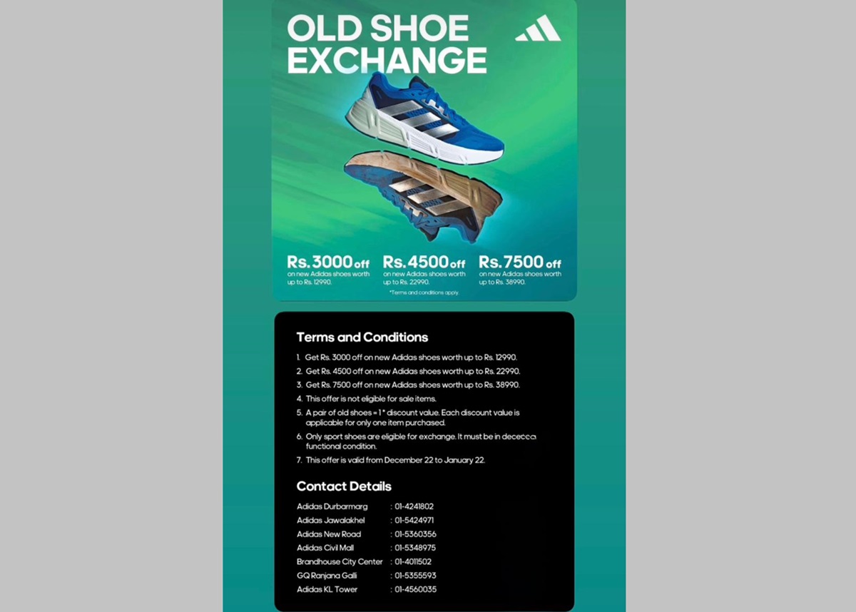 रुट्स फेसन नेपालका लागि एडिडासको आधिकारिक बिक्रेताले एक्सचेन्ज अफर सार्वजनिक गरेको छ।