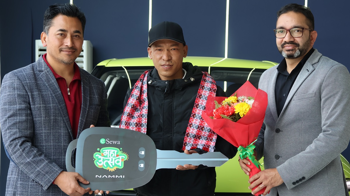 बम्पर उपहार विजेता हुन सफल रवि बम्जनलाई आज एक औपचारिक कार्यक्रम गरी इसेवाका प्रमुख रणनीतिक अधिकारी रवि शाक्य र फाइनान्स प्रमुख सरोज कुमार घिमिरेले कार हस्तान्तरण गरे।