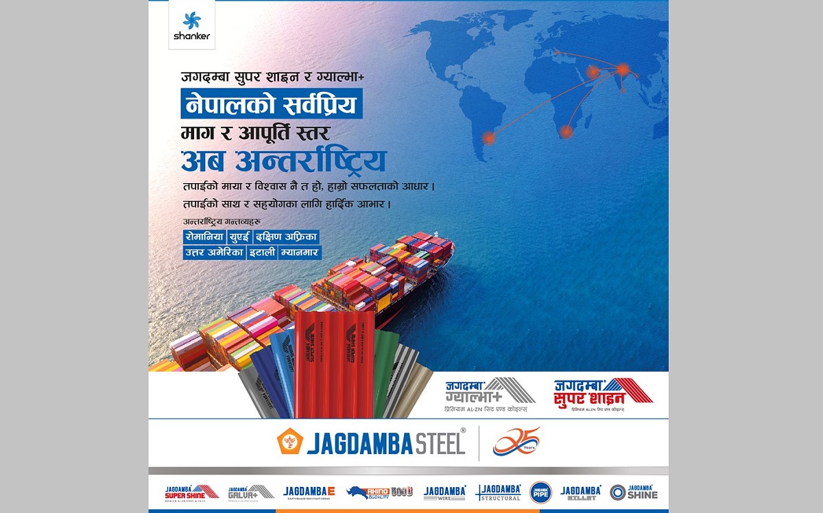 जगदम्बा स्टिल्सले नेपालको औद्योगिक इतिहासमै पहिलो पटक तेस्रो देशमा स्वदेशी उत्पादनको निर्यात थालेको छ।