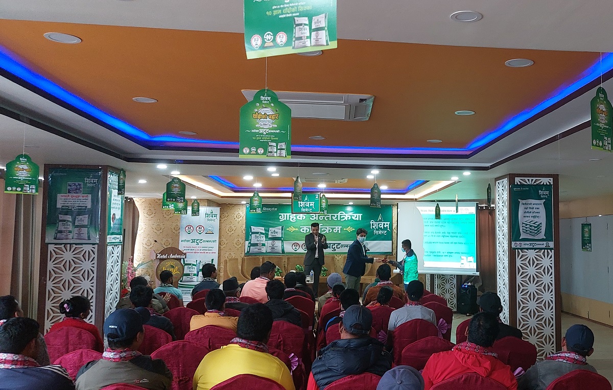 शिवम् सिमेन्टले चरिकोटमा निर्माणकार्य गरिरहेका ग्राहकहरूसँग 'ग्राहक अन्तक्रिया' कार्यक्रम सम्पन्न गरेको छ। निर्माण सम्बन्धी विभिन्न निकायका प्रतिनिधीहरू उपस्थित उक्त कार्यक्रममा हाल निर्माण कार्य गरिरहेका ४० ग्राहकहरू उपस्थित थिए।