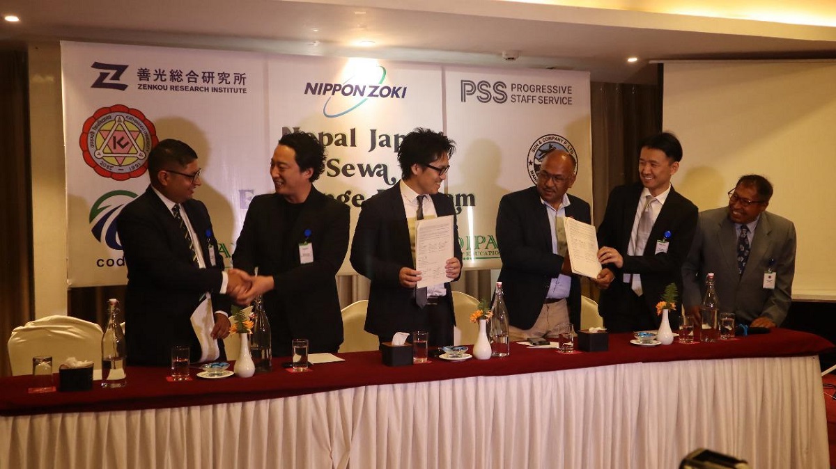 उक्त अवसरमा जापानका जेन्काउ रिसर्च इन्स्टिच्युटका, कोजाइ कोसन कर्पोरेसन प्रोग्रेसिभ स्टाफ एजेन्सी र नेपालका काठमाडौं विश्वविद्यालय स्कुल अफ मेडिकल साइन्स, सन एन्ड कम्पनी प्रालि र सन्दिपनी ग्रुप अफ एजुकेसनका प्रतिनिधिहरूले समझदारीपत्रमा हस्ताक्षर गरेका छन्।