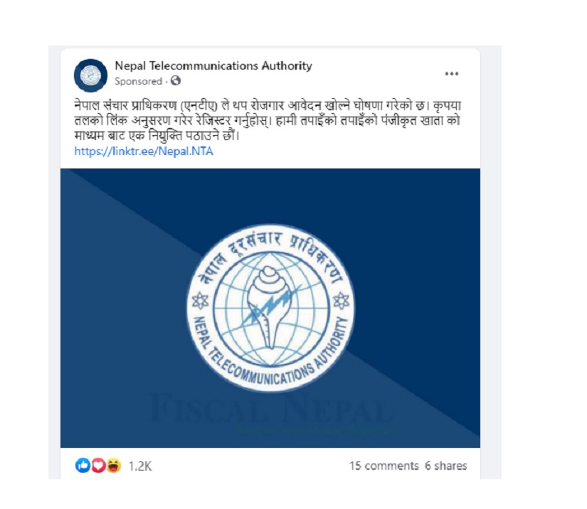 फेसबुकमा बुस्ट समेत गरिएको उक्त पेजबाट प्राधिकरणले रोजगारीका लागि अवसर खुलाएको र लिंकमा गएर दर्ता गर्न भनिएको छ।