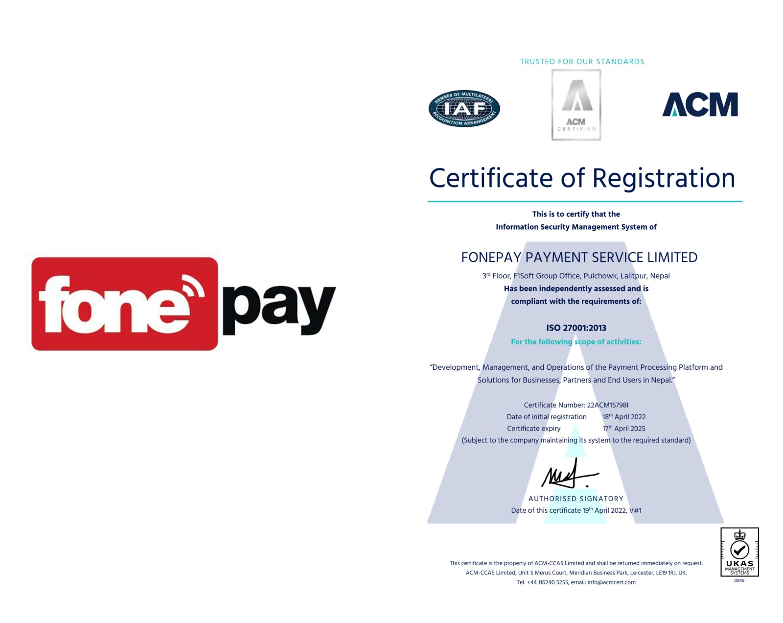 भुक्तानी प्रणाली सञ्चालक फोनपे पेमेन्ट सर्भिस लिमिटेड आइएसओ २७००१ः२०१३ बाट प्रमाणीकरण भएको छ।