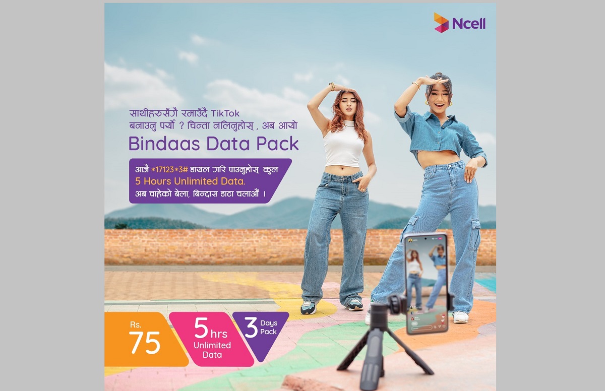 एनसेल आजियाटा लिमिटेडले प्रयोगको समयमाआधारित आकर्षक अफर 'बिन्दास डेटा प्याक' ल्याएको छ।