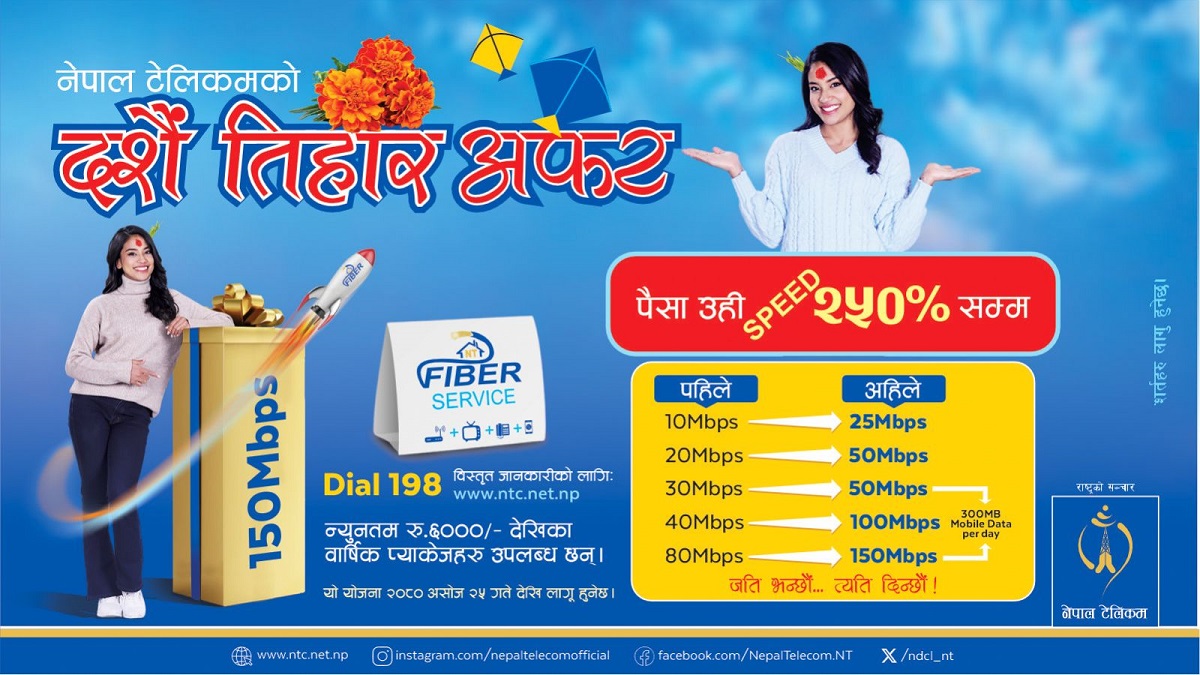 यस अफरअन्तर्गत सेवाग्राहीको अत्याधिक रुची देखिएको एनटी फाइबर सेवालाई थप आकर्षक बनाउन हाल उपलब्ध गराउँदै आएको स्पिडलाई २५० प्रतिशतसम्म पुग्नेगरी व्याण्डविथमा बढोत्तरी गरिएको टेलिकमको भनाइ छ।