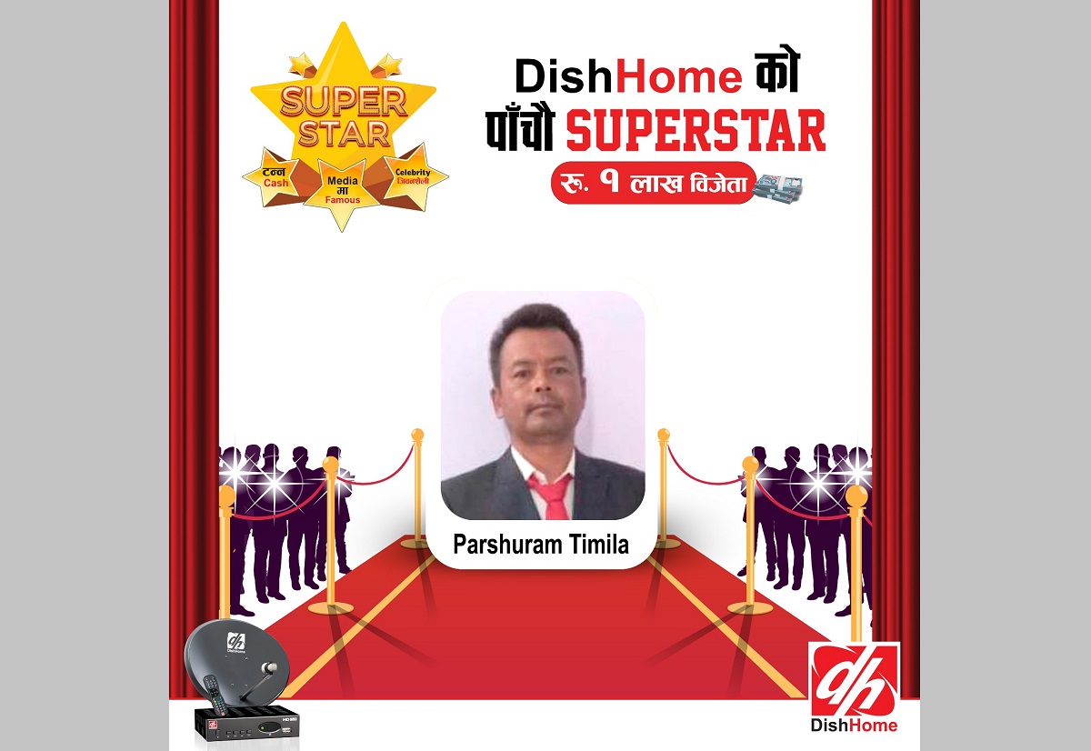 डिशहोमकाे 'हरेक हप्ता सुपरस्टार सिजनकै मेगास्टार' योजना अन्तर्गत ७१९०७५३८८८९ कास आइडीका ग्राहक परशुराम तिमिलाले एक लाख रूपैयाँ जितेका छन्।