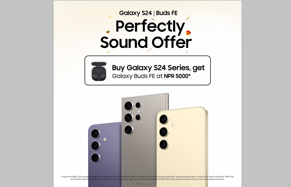 अब ग्राहकहरूले ग्यालेक्सी एस२४ सिरिजको स्मार्टफोन खरिद गर्दा पाँच हजार रूपैयाँ थप गरी १५ हजार मूल्य रहेको ग्यालेक्सी बड्स एफई पनि साथमा पाउन सक्नेछन्।