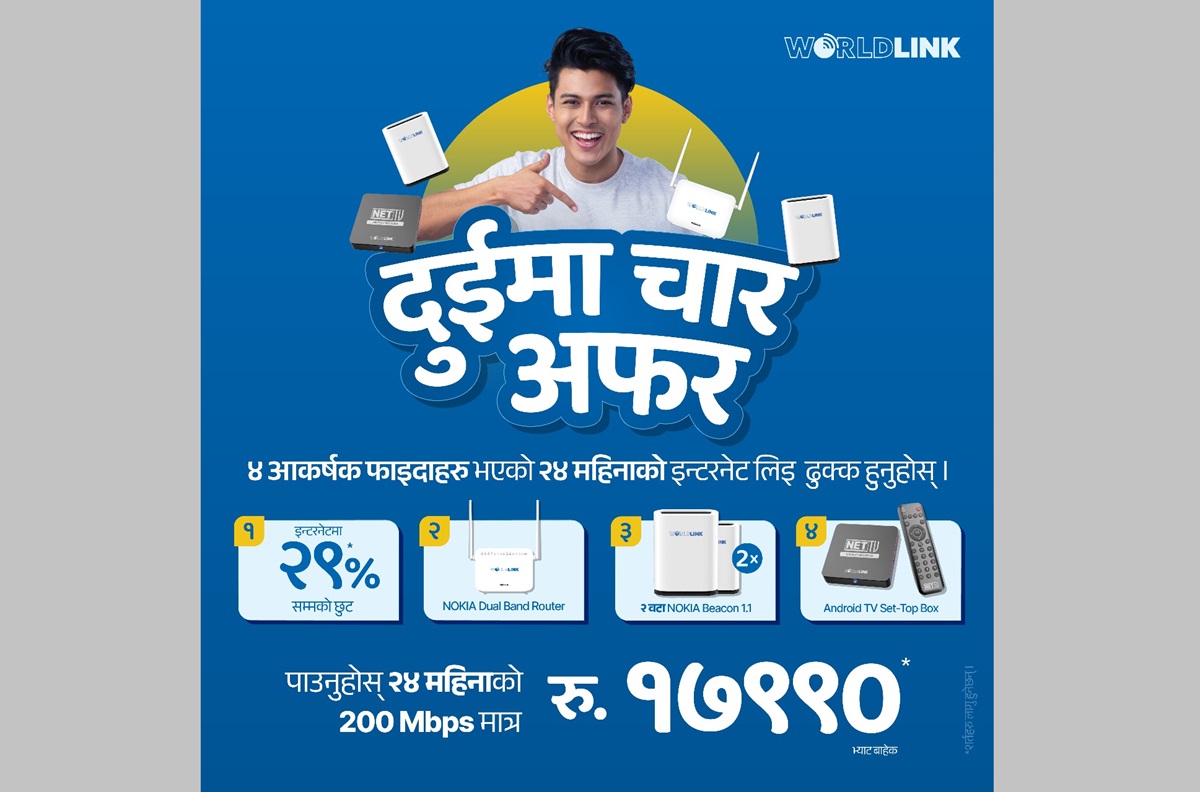 वर्ल्डलिंकको यो अफरमा सहभागी हुने ग्राहकले इन्टरनेटको नियमित प्याकेजमा २९ प्रतिशत छुटमा पाउनुका साथै नोकिया डुअल ब्यान्ड राउटर, दुई ओटा नोकिया बिकन १.१ र नेटटिभी एन्ड्रोइड सेट–टप बक्स समेत सित्तैमा पाउनेछन्।