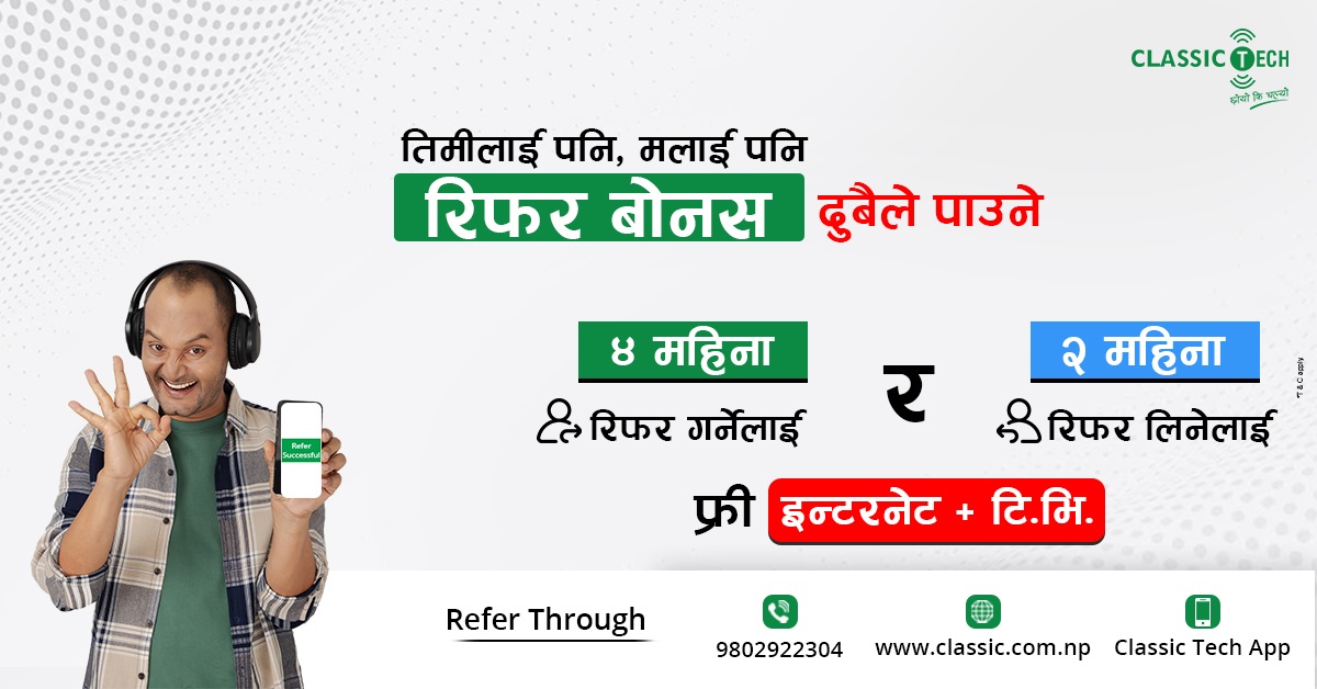 कम्पनीले क्लासिक टेक मोबाइल एपबाट रिफर गर्दा रिफर गर्ने र रिफर मार्फत इन्टरनेट + आइपी टिभी जडान गर्ने दुवै जनाको हात खाली नहुने अर्थात् दुवैको एकाउन्टमा बोनस थपिने गरी उक्त अफर सार्वजानिक गरेको हो।