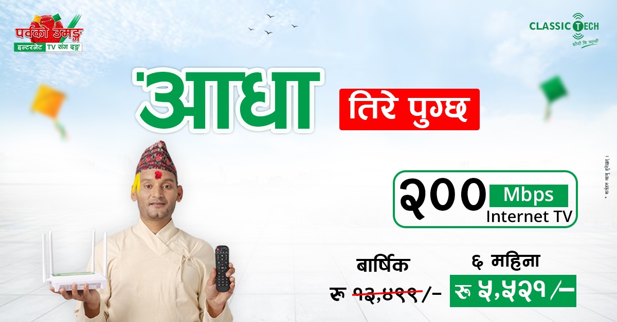 इन्टरनेट प्लस आइपी टिभी जडान गर्ने ग्राहकको चाहानालाई मध्यनजर गर्दै इन्टरनेट सेवा प्रदायक कम्पनी क्लासिक टेकले 'आधा तिरे पुग्छ' अफर सार्वजनिक गरेको छ।
