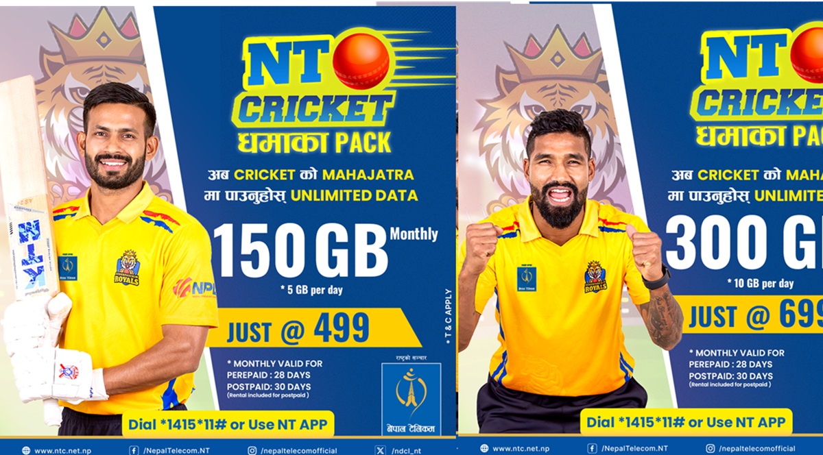 मंसिर १४ गतेदेखि आगामी पुस ६ गतेसम्म लागू हुने एनटी क्रिकेट धमाका प्याकहरु मोबाइलबाट*१४१५* ११# डायल गरेर वा नेपाल टेलिकमको मोबाइल एपमार्फत खरिद गर्न सकिने कम्पनीको भनाइ छ।
