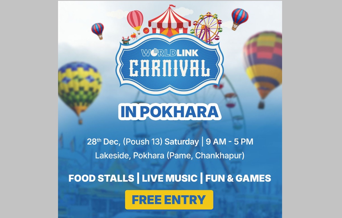 नेपालकै अग्रणी इन्टनेट सेवा प्रदायक कम्पनी, वर्ल्डलिंकले पोखरामा भव्य ‘कार्निभल’को आयोजना गर्ने भएको छ।