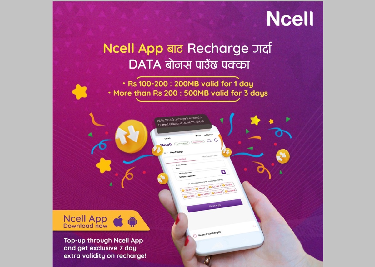 एनसेल एपमार्फत १०० रूपैयाँदेखि २०० रूपैयाँ सम्मको अनलाइन रिचार्ज गर्दा ग्राहकहरूले १ दिनको लागि २०० एमबी बोनस डेटा प्राप्त गर्दछन्।