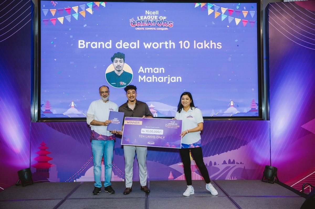 एनसेलले अपट्रेन्डलीसँगको सहकार्यमा आयोजना गरेको ‘लीग अफ क्रिएटर्स’ प्रतियोगितामा ललितपुरका अमन महर्जनले १० लाख रुपैयाँबराबरको एक वर्षको ब्रान्ड डिल जित्न सफल भएका छन्।