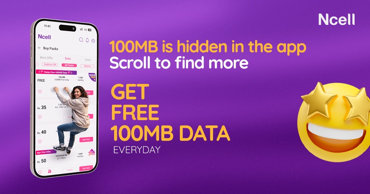 एनसेलले ग्राहकका लागि एनसेल एपमार्फत दैनिक १०० एमबी निःशुल्क डेटा पाइने अफर सञ्चालनमा ल्याएको छ।