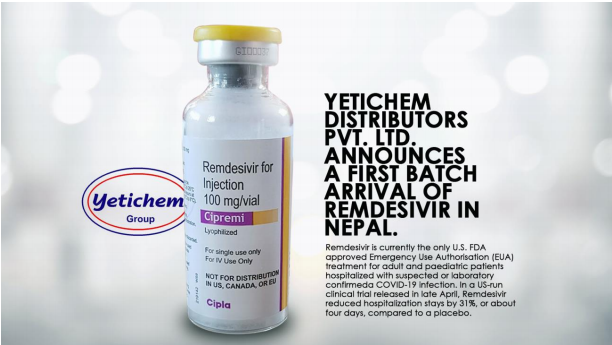 रेम्डेसिभिर नामक औषधिको पहिलो ब्याच नेपालमा आइपुगेको छ। यतिकेम वितरक प्रालिले कोभिड–१९ संक्रमितलाई प्रयोग हुने उक्त औषधि नेपालमा ल्याइएको घोषणा गरेको हो।