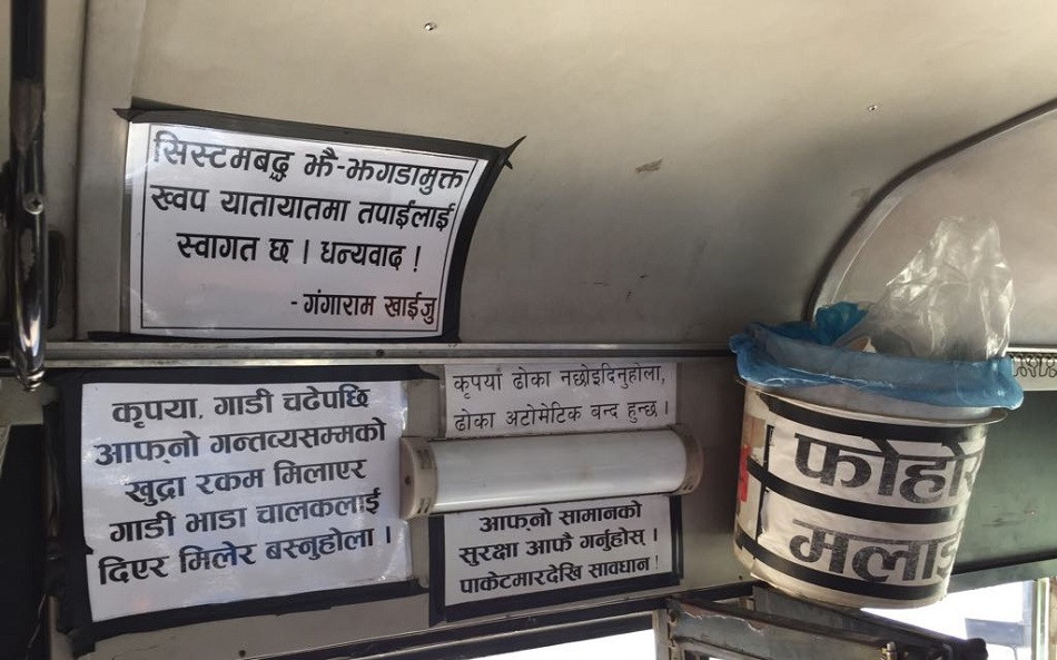 ‘कृपया गाडी चढेपछि आफ्नो गन्तव्यसम्मको खुद्रा रकम मिलाएर गाडी चालकलाई दिनुहोला।’ ‘गाडीमा सहचालकको व्यवस्था नभएकोले सिट तथा खाली ठाउँमा आफै मिलेर बसिदिनुहुन अनुरोध छ।’
