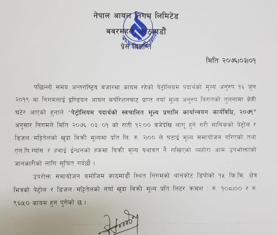 पेट्रोल, डिजेल र मट्टितेलमा प्रतिलिटर २ रुपैयाँका दरले मूल्य घटाइएको निगमले जनाएको छ। हवाई इन्धन तथा खाना पकाउने एलपी ग्यासको मूल्य भने यथावत छ।