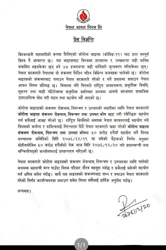 नेपाल आयल निगमले कोरोना रोकथाम उपचार तथा राहत कोषमा ५० करोड सहयोग गरेको छ।