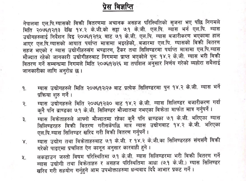 विश्वव्यापी रूपमा कारोना भाइरसको संक्रमणसँगै उपभोक्ताले घरमा ग्यास मौज्दात गर्न थालेपछि बजारमा ग्यासको अभाव सिर्जना भएको थियो।
