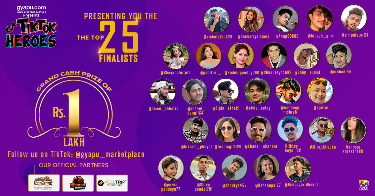 नेपाली ई-कमर्स कम्पनी ग्यापु 'टिकटक हिरोज'का उत्कृष्ट २५ सहभागीको नाम सार्वजनिक भएको छ। करिब ५ हजार ६०० जना सहभागीबाट छानिएर यस अगाडि ग्यापुले उत्कृष्ट ५० को नाम सार्वजनिक गरेको थियो।