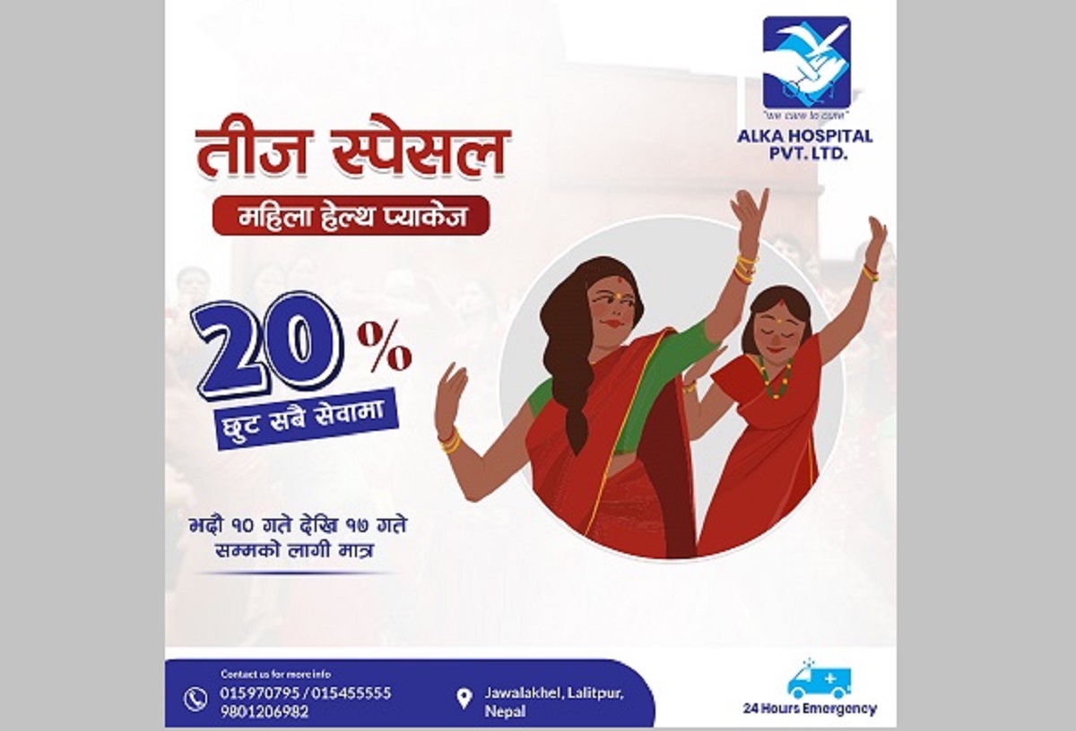 अल्का अस्पतालले तीजको अवसरमा महिलाहरूलाई छुटको योजना ल्याएको छ।