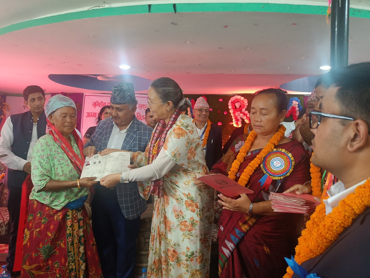 राष्ट्रिय भूमि आयोग जिल्ला समिति मोरङमार्फत कानेपोखरी गाउँपालिकाको वडा नं. ६ का २७ भूमिहीन सकुम्वासी र ९ भूमिहीन दलित घरपरिवारलाई मन्त्री श्रेष्ठले लालपूर्जा वितरण गरेकी हुन्।
