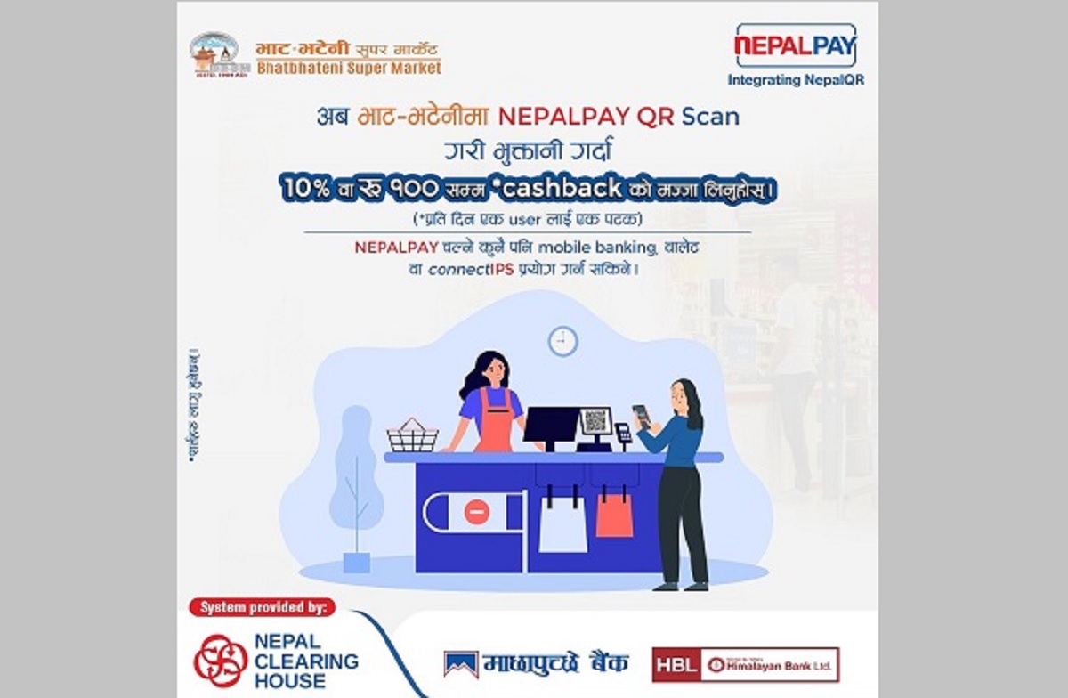 भाट–भटेनी सुपरमार्केटका ग्राहकहरूले अब नेपाल पे क्युआर स्क्यान गरी भुक्तानी गर्दा १० प्रतिशत (अधिकतम एक सय रुपैयाँसम्म) क्यासब्याक प्राप्त गर्न सक्नेछन्।