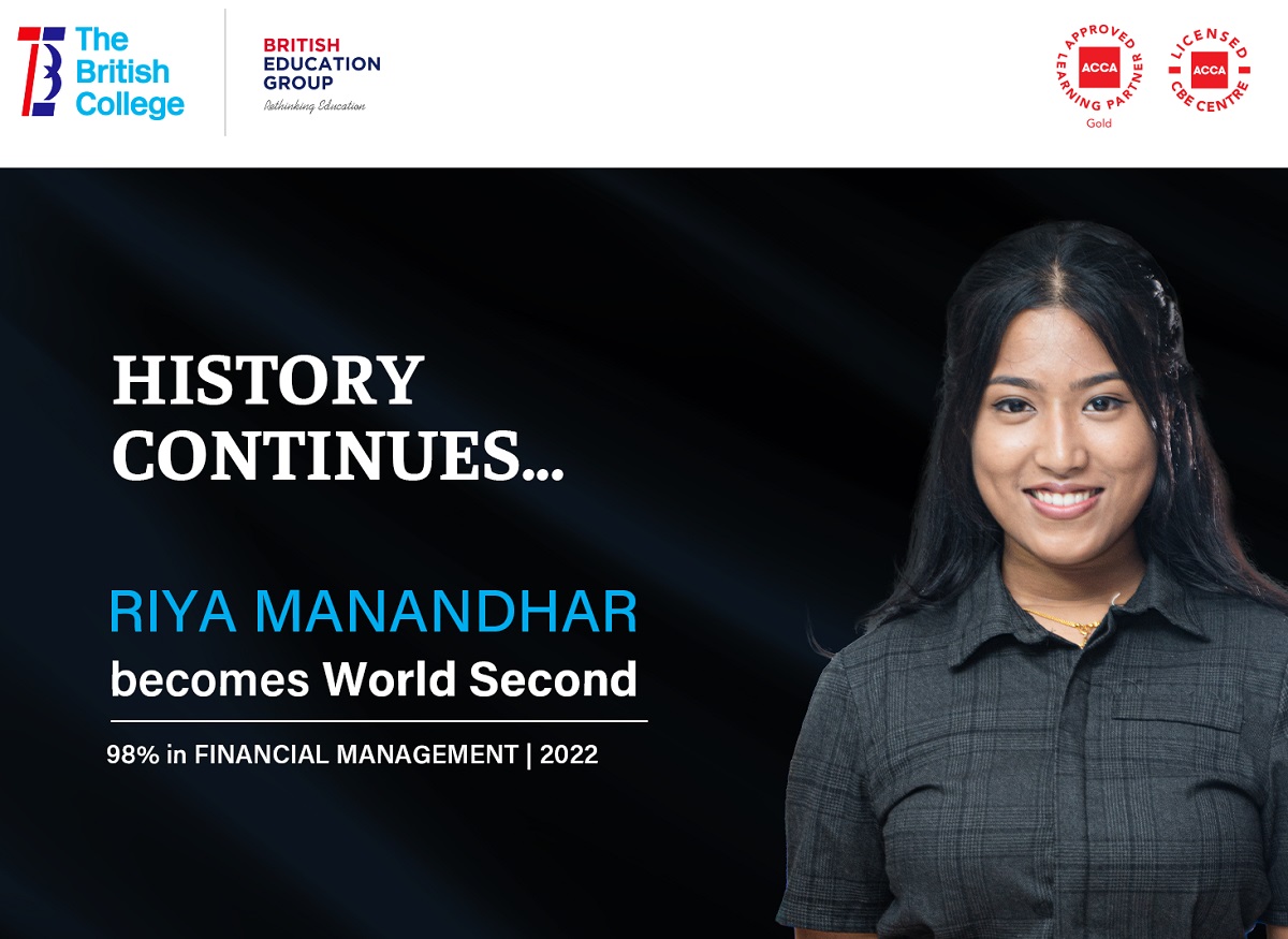 द ब्रिटिस कलेज अन्तर्गतको ब्रिटिस प्रोफेसनल कलेज (बिपिसी)मा अध्ययनरत रिया मानन्धर तेस्रो पटक विश्वकै दोस्रो सर्वोत्कृष्ट छात्रा बन्न सफल भएकी छन्।