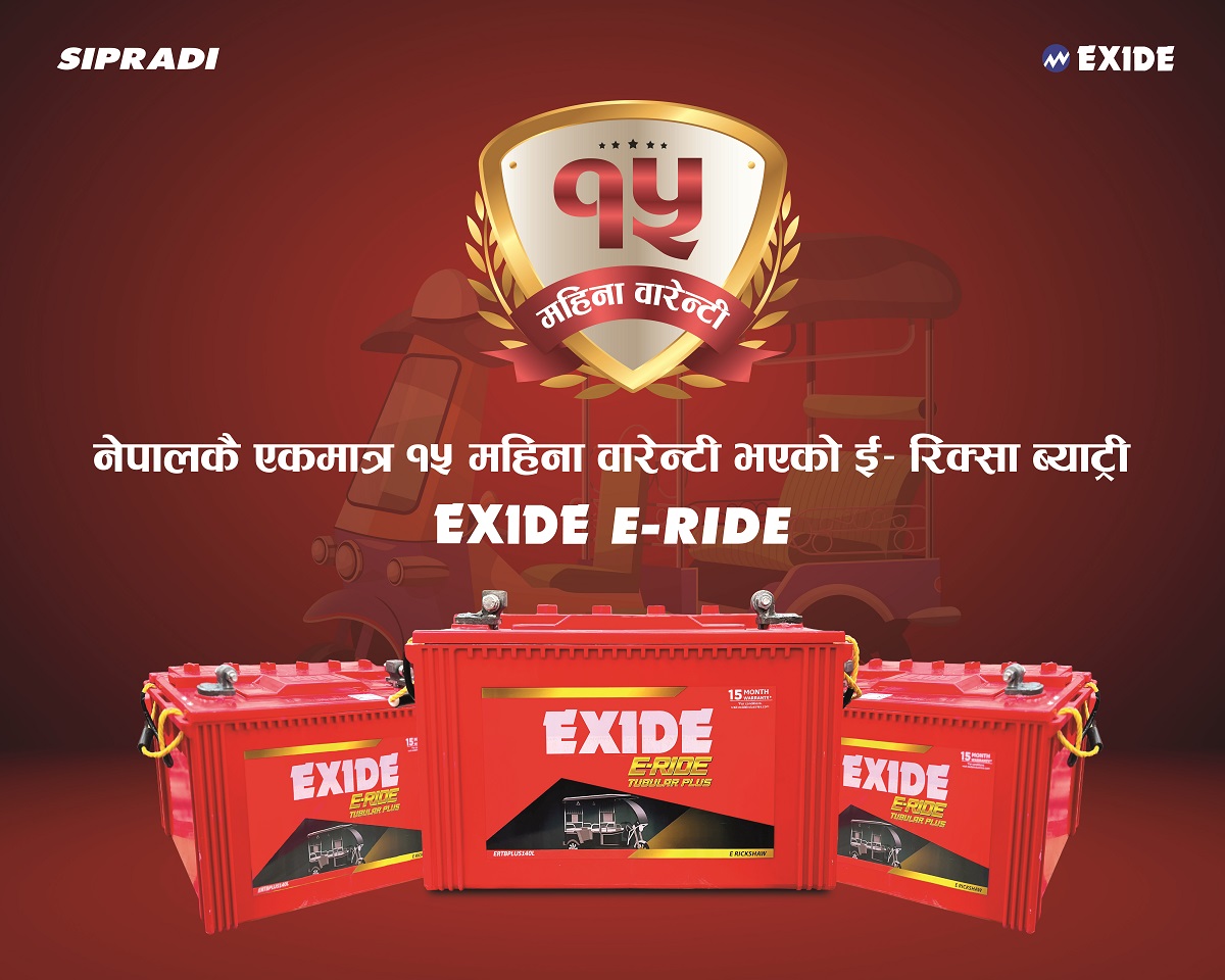 एक्साइड ब्रान्डको इ-रिक्सा ब्याट्रीमा १५ महिनाको वारेन्टी दिइएको छ।