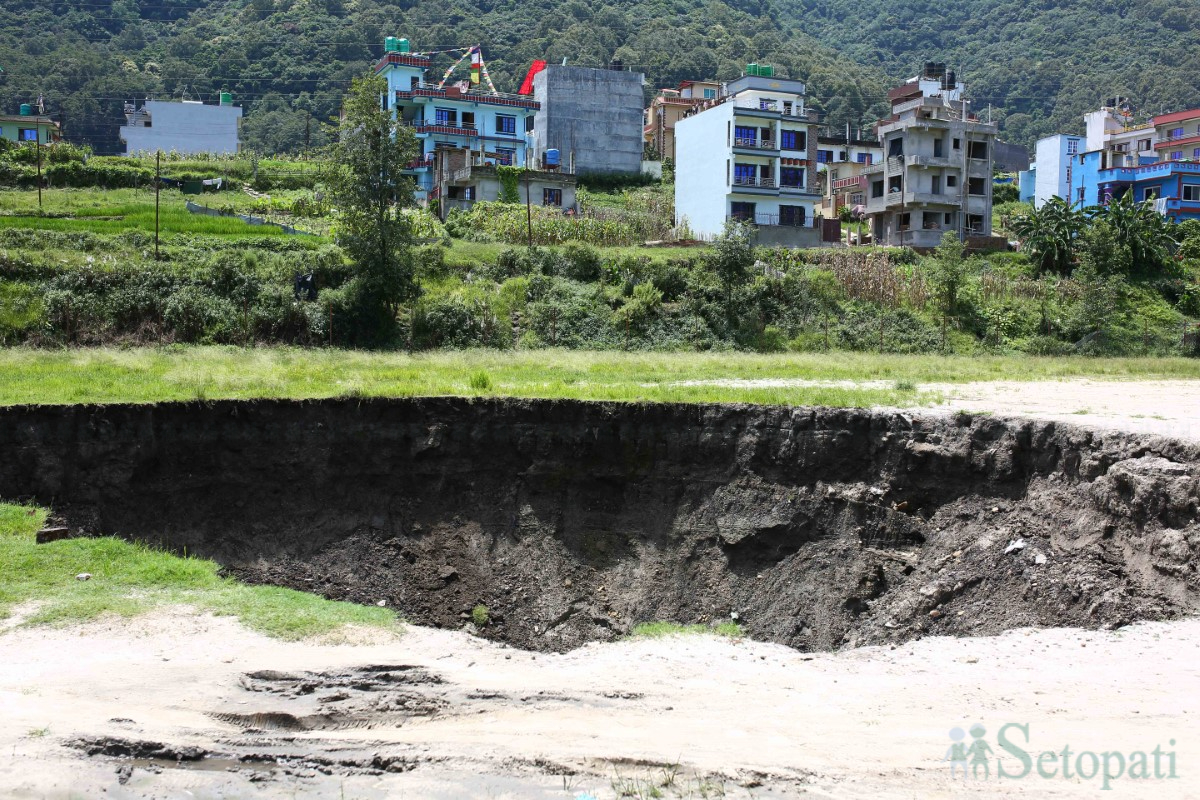 तारकेश्वर नगरपालिका-५ अर्यालटारमा खोला पुरी बनाएको खेल मैदान भासिएको छ।