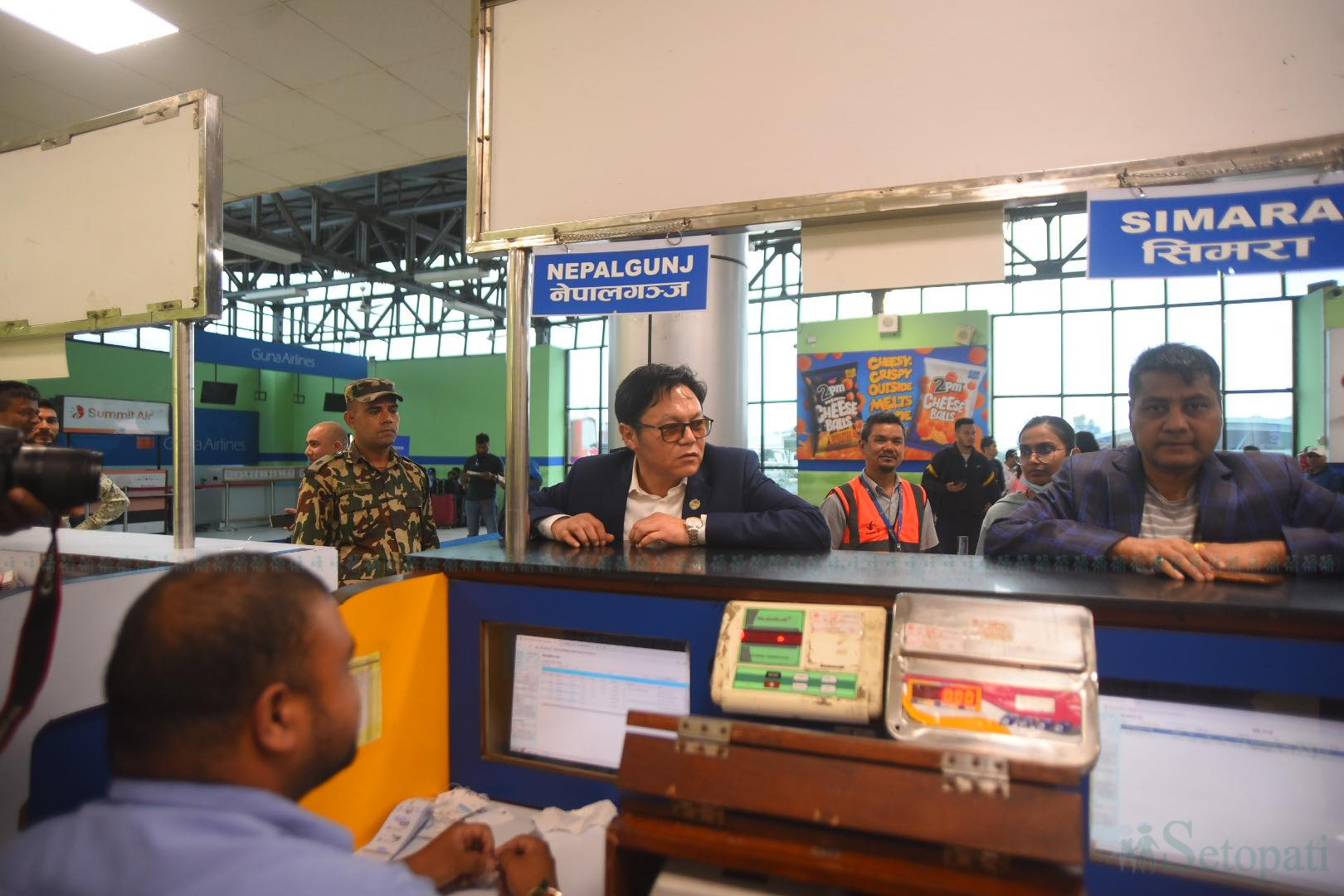 त्रिभुवन अन्तर्राष्ट्रिय विमानस्थलको आन्तरिक टर्मिनलमा संस्कृति, पर्यटन तथा नागरिक उड्डयन मन्त्री सुदन किराँतीले अनुगमन गरेका छन्।