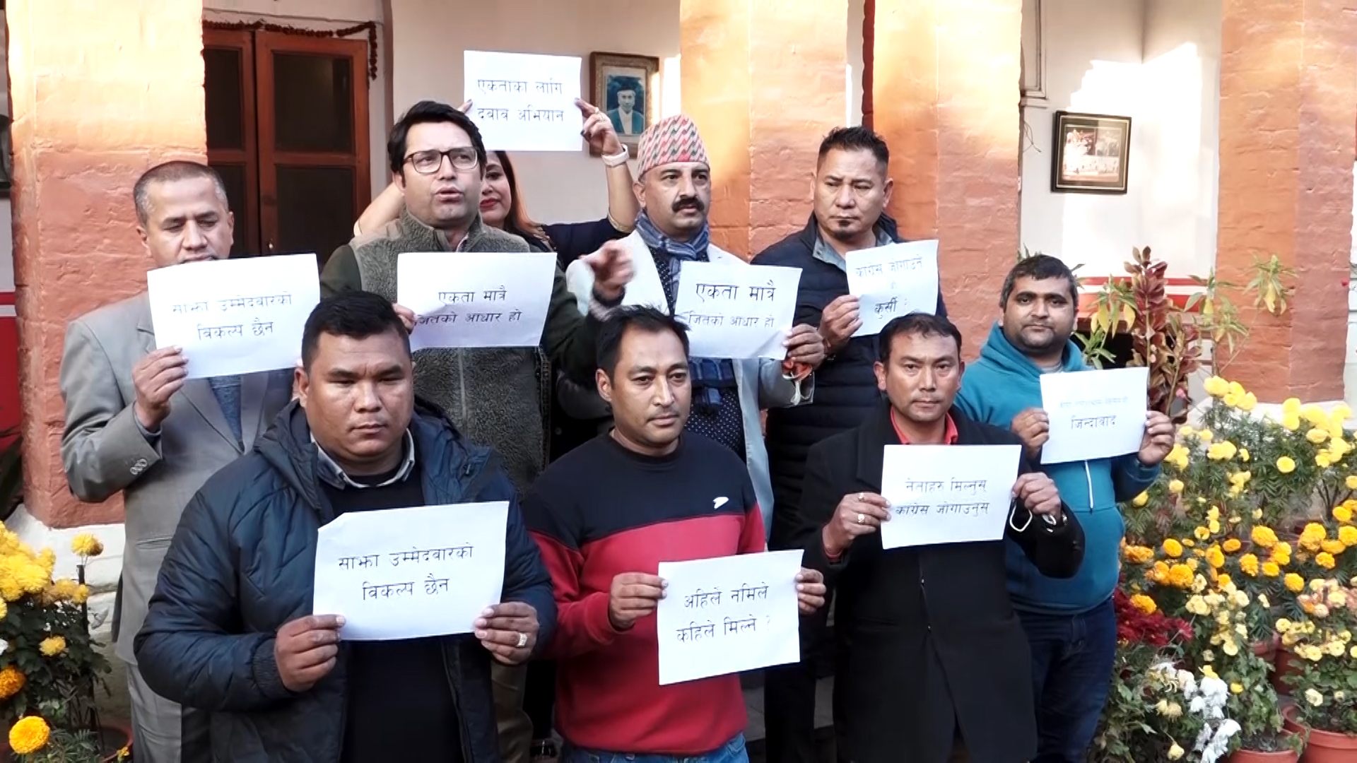 नेपाली कांग्रेसको १४ औं महाधिवेशनमा सभापतिको साझा उम्मेदवार बनाउने सम्बन्धमा संस्थापनइतर समूह नेता सिंहको घरमा बैठक बसिरहेको समयमा मंगलबार साझा उम्मेदवारको विकल्प नभएको भन्दै प्रदर्शन भएको छ।