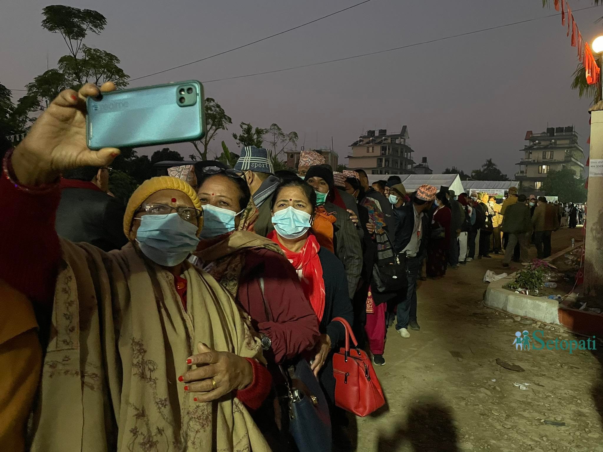 मतदानका लागि मतदाताको लामो लाइन छ। रातभर जाग्राम बसेर मतदानका लागि बसेका प्रतिनिधिहरू बिहान पुनः लाइन लागेर भोट हाल्न तयार छन्।