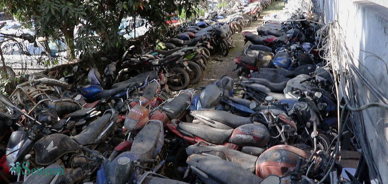 काठमाडौं उपत्यकाका विभिन्न ट्राफिक कार्यालयमा वर्षौंदेखि मोटरसाइकल/स्कुटर थन्किएर बसेका छन्।