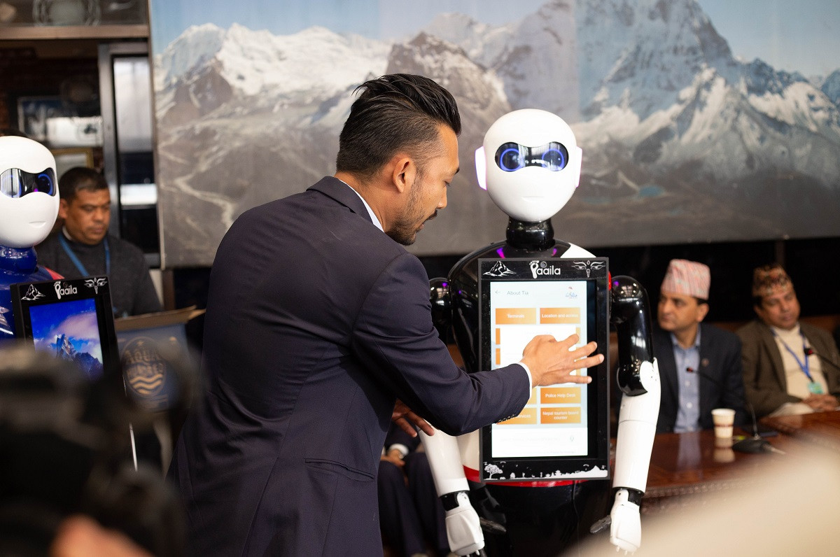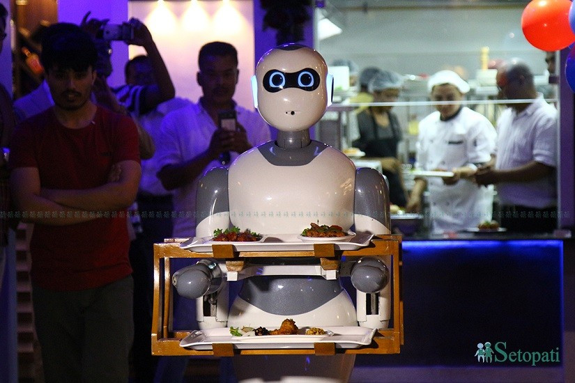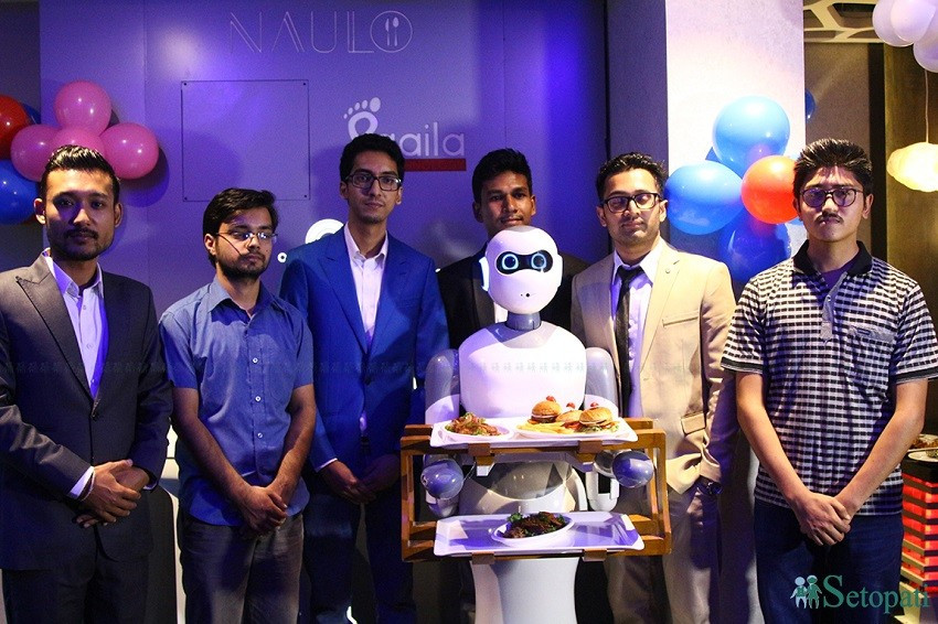 पाइला टेक्नोलोजीद्वारा सञ्चालित 'नौलो रेस्टुरेन्ट' को रोबोटसँग। तस्बिरः सेतोपाटी