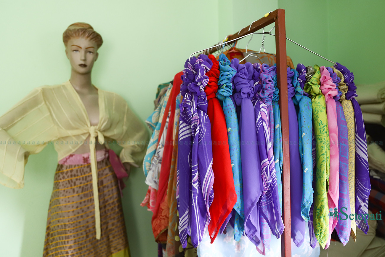 'सारीको काम मौसमी हो। लुगाहरू पातला बन्छन्। प्रायः गर्मी मौसममा बढी बनाइन्छ,' उनले भनिन्, 'जाडोका लागि उपयोगी के सामान बन्छ, हामी बुझ्दै छौं। ब्याग, हेयर ब्यान्डजस्ता सामान भने बनाइरहेका छौं।'