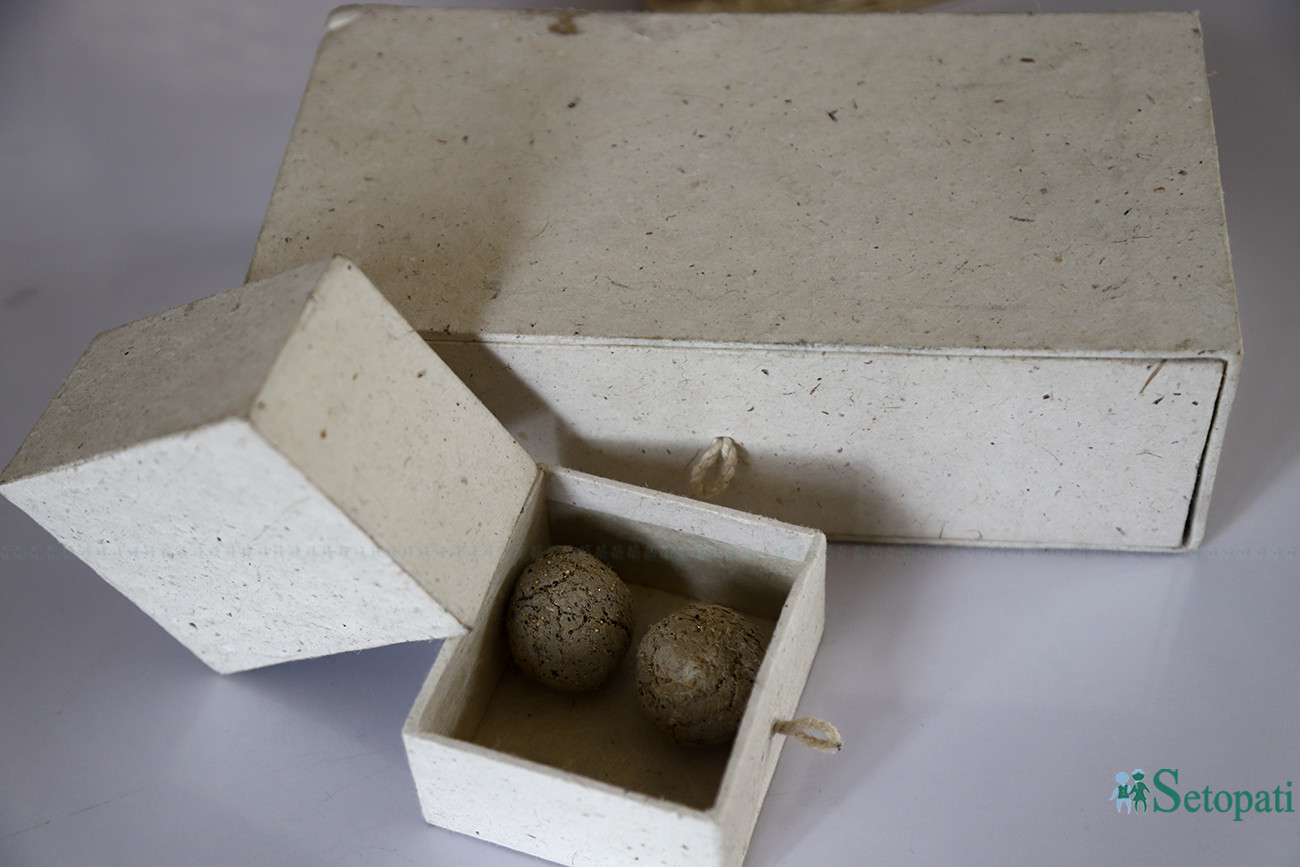 हात्तीको गोबरबाट बनेका कागजका बाकस। तस्बिरः निशा भण्डारी/सेतोपाटी