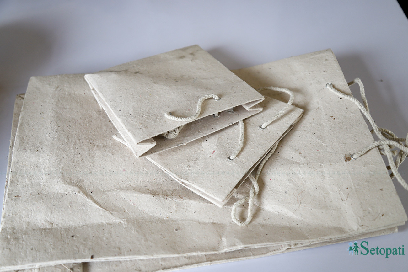 हात्तीको गोबरबाट बनेका कागजका झोला। तस्बिरः निशा भण्डारी/सेतोपाटी