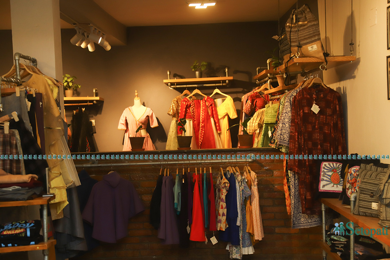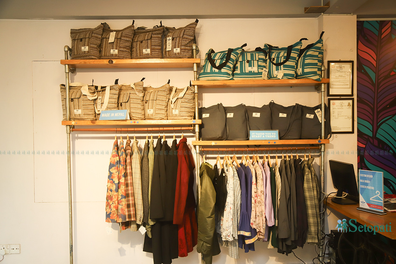 'विभिन्न डिजाइनका झोला, ह्यान्ड ब्याग, पर्स हाम्रो मुख्य उत्पादन हो,' उत्पादनबारे विजेशले भने, 'सल, गाउन, लेहेंगा-चोली, किमोनो, वानपिस र बच्चाका लुगा हाम्रो दोश्रो प्राथमिकतामा पर्छन्।'