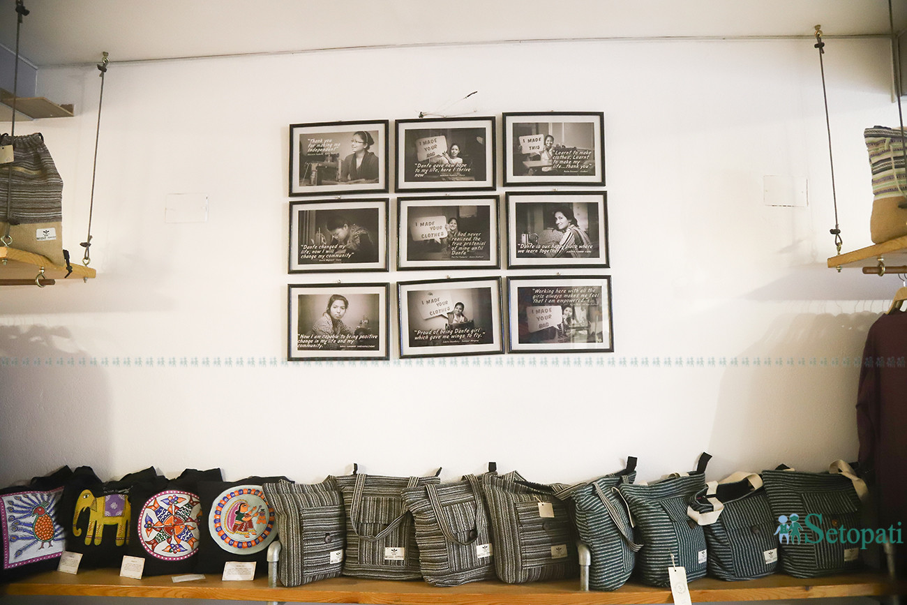 झम्सिखेलस्थित डाँफे आउटलेटमा थुप्रै महिलाका फोटा सजिएका छन्। कोही 'तपाईंको झोला बनाउँछु' भन्दै आफ्नो सीप बताइरहेका छन्। कोही 'लुगा बनाउँछु' भन्दै डाँफेले जीवन बदलेकोमा कृतज्ञ छन्।