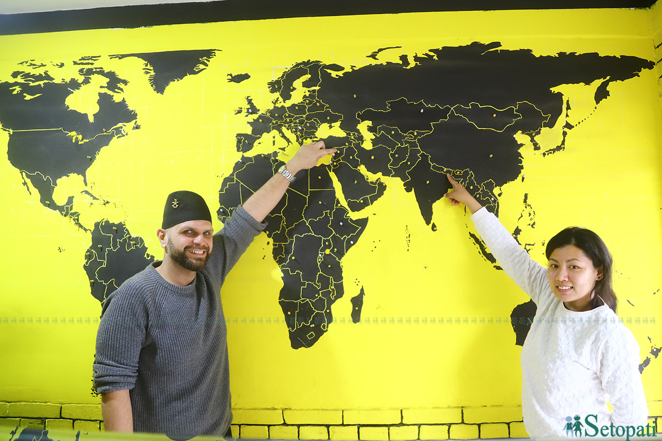 बेसल र संगीता ताजा रेस्टुरेन्टको भित्तामा अंकित आ-आफ्ना देशका नक्सा देखाउँदै। तस्बिरः निशा भण्डारी/सेतोपाटी