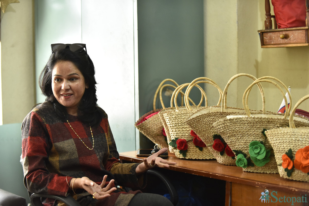 'अहिले चीनबाट वार्षिक दस लाख वटाको माग छ,' उनी भन्छिन्, 'त्यसैले मैले झोलाका विभिन्न डिजाइनबारे तालिम लिएँ। १३ जिल्लाका दिदीबहिनीसँग सहकार्य पनि थालेकी छु।'