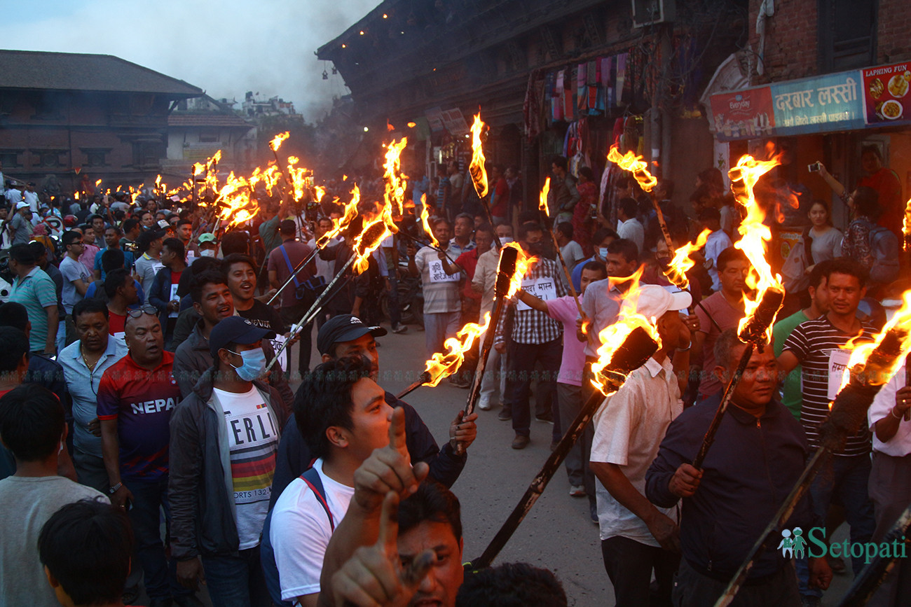 गुठी विधेयकको विरोधमा शुक्रबार पाटन, मंगलबजारमा आयोजित मसाल जुलुस। तस्बिर: निशा भण्डारी/सेतोपाटी