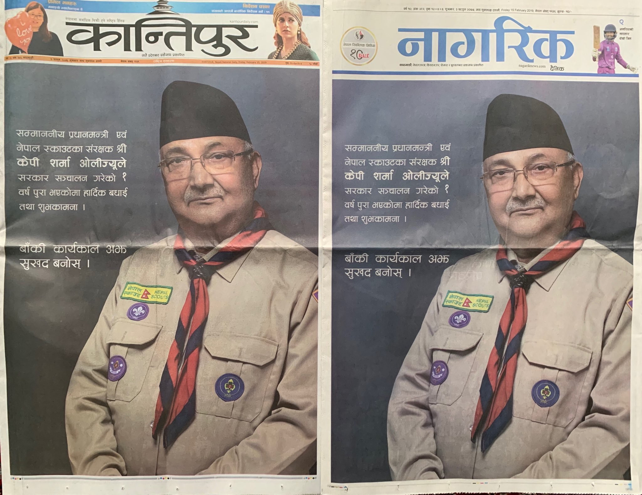 पार्टी प्यालेसको भाडा र ट्राभलका गाडीको पार्किङबाट उठेको धन भएर त होला, अस्ति ओली सरकारलाई स्काउट पोसाकमा सजाएर ठूला पत्रिकाहरूमा महंगा 'ज्याकेट एड' छाप्ने बुद्धि पलाएको।